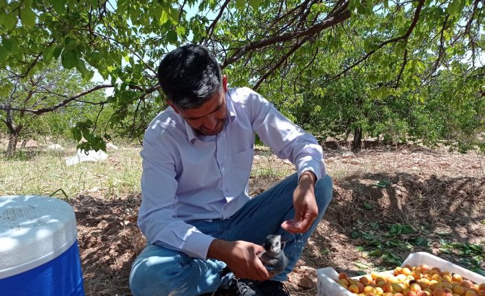Çiftçi Bilal Korkmaz, yavru kargaya elleriyle su içirdiğini belirterek, “Kayısı topluyorduk, yavru yuvadan düşmüş. Su verdik ve tekrar yerine bırakacağız. Hayvan susamıştı. Ellerimizle su içirdik. Doydu, sıcaktan baygınlık geçiriyor” diye konuştu.