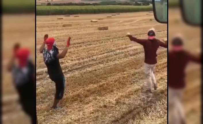 Tekirdağ’ın Malkara ilçesinde tarlaya saman balyası yüklemeye getirilen hamallara müzik açılınca ortaya renkli görüntüler yansıdı.