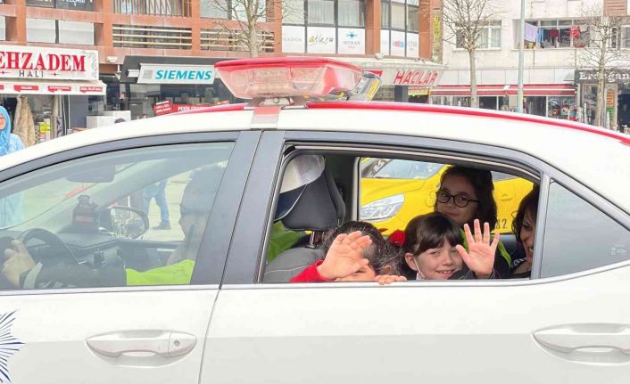 DÜZCE (İHA) – Düzce’de 23 Nisan Ulusal Egemenlik ve Çocuk Bayramı’nda polisler miniklere sürpriz yaptı. Çocuklar ile polisler konvoy yapıp, halkı selamlarken, konvoy sonunda ise trafik eğitimi alarak unutulmaz bir gün yaşadı.