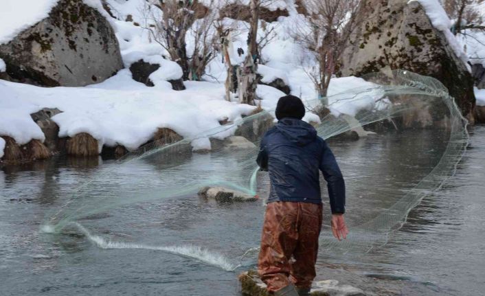 Beytüşşebap ilçesinde bulunan Habur Çayı, kış aylarında buz gibi suda, hava sıcaklığının eksi 21 dereceyi bulmasıyla vatandaşlar, serpmelerle balık avına çıkıyor. Kilosunu 25 liradan satarak geçimini sağlayan yöre halkı, soğuk havalara aldırış etmeden giydikleri tulumlar sayesinde 2 metreyi bulan derinliklerde alabalık avlamaya çalışıyor.