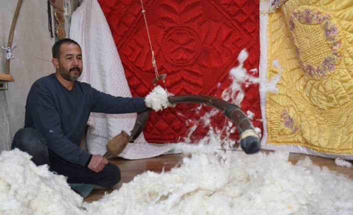 Mersin’in Tarsus ilçesinde teknolojinin unutturduğu mesleklerden hallaçlığı 33 yıldır sürdüren Erol Ayaz, yay ve tokmakla pamuk ile yünü kabartarak mesleğini sürdürüyor.
