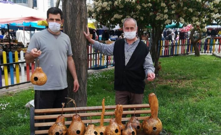 Samsun’da vatandaşlar, su kabaklarından yaptıkları kuş yuvalarını parklardaki ağaçlara astı.