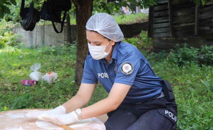Gölyüzü Mahallesi’nde Kızılay Bolu Şube Kadın Teşkilatı Başkanı Ünsal Toylan’ın evinin bahçesinde bir araya gelen kadınlar, çorba yapılmak üzere hazırladıkları tarhanaları tek tek örtülerin üzerine sererek kurumaya bıraktı. Aynı zamanda hamur açan kadın polisler ve Kızılay gönüllüleri, yaptıkları ürünleri belirlenen ihtiyaç sahiplerine dağıtacak.