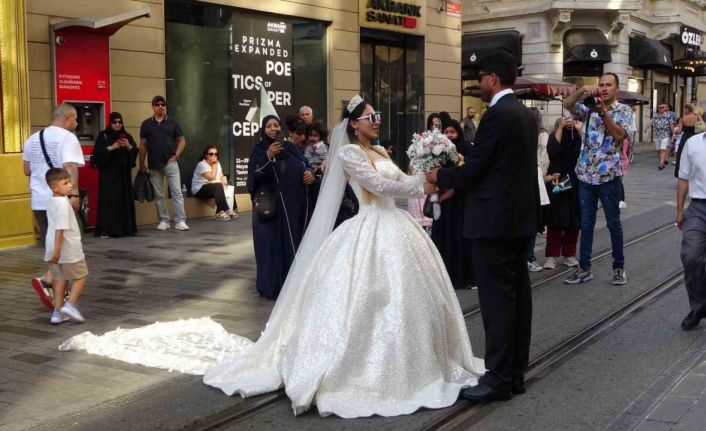Taksim Meydanı’na düğün fotoğrafı çektirmek için gelen yabancı gelin ve damat, vatandaşların yoğun ilgisiyle karşılaştı.
