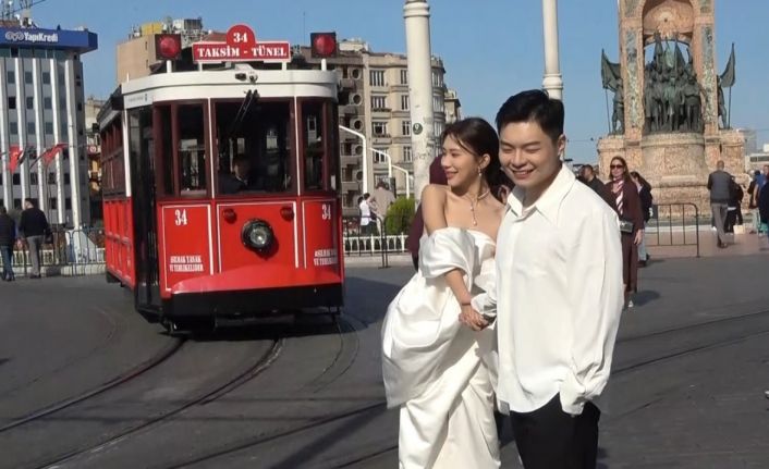 Yerli ve yabancı turistlerin uğrak noktası olan Taksim Meydanı, bu sefer Çinli gelin ve damadı ağırladı. Çin’den evlenmek için İstanbul’a gelen çift, fotoğraf çekimi için Taksim Meydanı ve İstiklal Caddesi’ni tercih etti. Düğün fotoğraflarını Taksim Meydanı ile çevresinde çektiren çift, İstiklal Caddesi girişindeki nostaljik tramvaya binerek poz verdi. Çinli gelin ve damadı gören yerli ve yabancı turistler ise cep telefonlarıyla genç çiftin fotoğraflarını çekti.