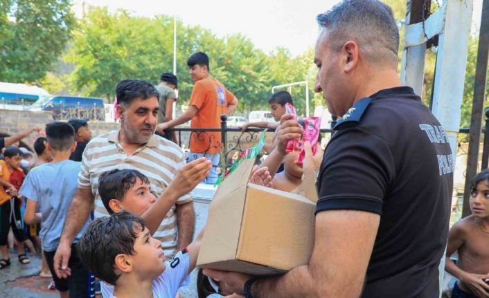 Diyarbakır İl Emniyet Müdürlüğü Trafik Denetleme Şube Müdürlüğü ekipleri, sıcaktan bunalıp Anzele suyuna giren çocuklara dondurma dağıttı.