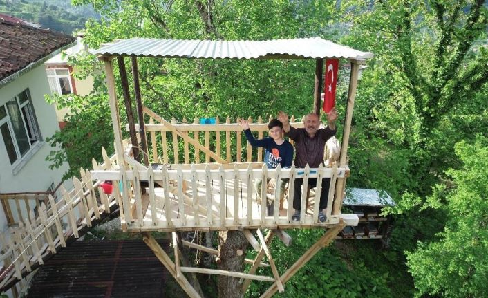 Artvin’in Arhavi ilçesinde yaşayan emekli öğretmen Ali Türk, torunu ağaç ev isteyince evinin bahçesinde bulunan meyve ağacının üzerine ağaç ev yaptı. Oturduğu evin hemen önünde bulunan ağaca ulaşımı ise balkondan yaptığı ahşap merdiven aracılığıyla sağlıyor.