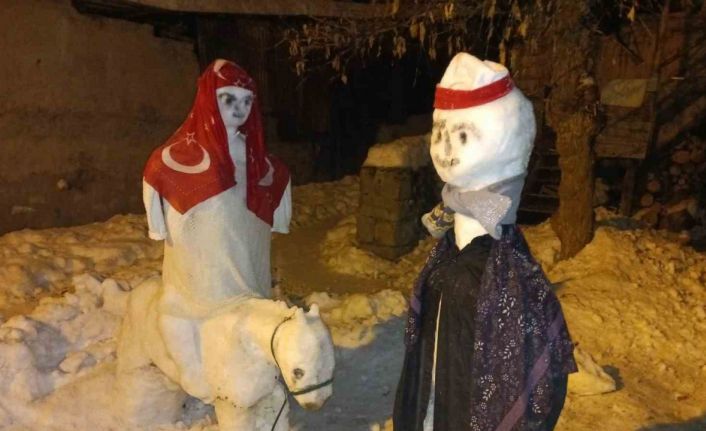 Erzurum’un Oltu ilçesinde Muhtar, İsmail Altaş, torununu mutlu etmek için kardan gelin, damat ve at heykeli yaptı.