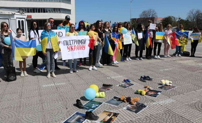 Basın açıklamasında ayrıca Ukraynaca, Rusça, Türkçe “Savaşa hayır, savaşı durdurun, Rusya dur” yazılı pankartlar ve dövizler açılırken, Ukraynalı çocukların savaştan kaçarken getirdiği eşyalar da fotoğraflar ile birlikte yere serildi.