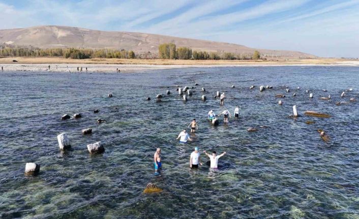 Van Gölü aktivistleri, Van Gölü’nde suların çekilmesiyle gün yüzüne çıkan antik yolda yüzme etkinliği gerçekleştirdiler.