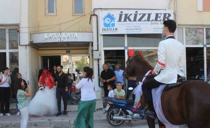 Aslen Erzurumlu olan Ekrem Erkan, Karapınarlı kız arkadaşı Ayşenur Boztaş’a daha önce vinç kiralayarak evlilik teklif etti. Erkan, kız arkadaşının oturduğu apartmanın önüne gitti ve vincin sepetine binerek 5. kata çıktı. Klarnet çalan genç, pankart açıp cam önünde serenat yaparak evlenme teklifi yaptı. “Evet” cevabını alan Erkan, düğün hazırlıklarını başladı. Ailesi ve yakınları ile birlikte Ankara’dan Karapınar’a gelen Ekrem Erkan, bu defa da gelin almaya at üzerinde geldi. Beyaz smokini ile at üzerine hayat arkadaşının evden çıkmasını bekleyen genç damadın yakınları, apartman önünde oynayıp halay çekti.