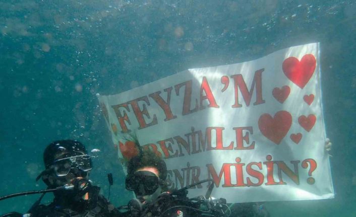 Yalova’da kız arkadaşı Feyza Ünal ile denizde tüplü dalış yapan Kenan Esen, hazırladığı pankartla evlilik teklifinde bulundu. Hayatında ilk kez dalış yapmanın heyecanını yaşayan Ünal, sürpriz evlilik teklifine kabul etti.