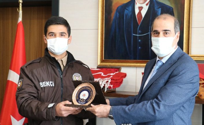 Kahramanmaraş İl Emniyet Müdürü Salim Cebeloğlu makam odasında, Onikişubat ilçesinde görevli çarşı ve mahalle bekçisi Fatih Tilki’ye sergilediği davranıştan dolayı teşekkür etti. Çarşı ve mahalle bekçilerinin suçlularla mücadelede önemli görevler üstlendiğini belirten Cebeloğlu, “4 Mart’ta gece saat 03:00 sıralarında Onikişubat ilçesi Şehit Evliya Mahallesi’nde bir ikamet yangını çıktı. Yaşlı bir çiftimiz yaşıyordu ikamette ve anonsu alır almaz en yakın noktadaki çarşı ve mahalle bekçimiz olay yerine intikal edip. Yangın sırasında canı pahasına vatandaşımızın hayatını kurtardı. Çarşı ve mahalle bekçimizi tebrik ediyorum. Bütün mahalle bekçilerimizi kutluyorum. Bugüne kadar çarşı ve mahalle bekçilerimizi 22 çalıntı araç yakaladılar. 271 aranan şahıs yakaladılar, 76 ateşli silah ele geçirdiler, 94 narkotik olayına müdahale ettiler ve 34 hırsızlık olayında da suçüstü yakaladılar” dedi.