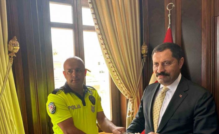 Hatay Valisi Mustafa Masatlı’da polis memurunu Valilik makamında ağırlayarak özverili davranışından dolayı hediye ile ödüllendirdi.
