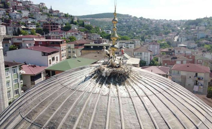 Kocaeli’de bir caminin kubbesine yuva yapan anne leylek ve yavruları ilçede yaşayan vatandaşların ilgi odağı oldu.