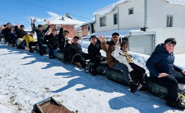Yüksekova’da çocuklar bidonla kaymanın keyfini çıkardı