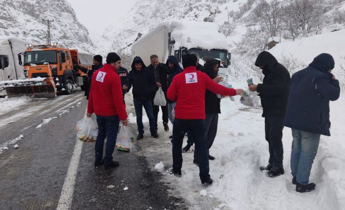 Kızılay Hakkari Şubesi ve AFAD İl Müdürlüğü ekipleri, iki gündür devam eden kar yağışı nedeniyle yollarda kalan sürücülere kumanya dağıttı.