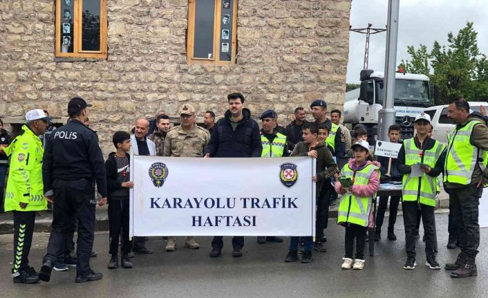 Hakkari’nin Çukurca ilçesinde Karayolu Trafik Güvenliği Haftası nedeniyle çocuklar sürücülere broşür dağıttı.