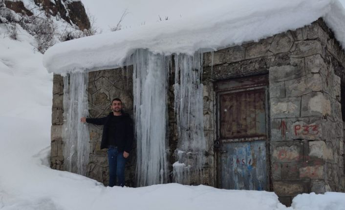 İlçede çatılarda oluşan buz sarkıtlarının uzunluğu 3 metreyi aştı. Bazı gençler buz sarkıntıların önüne geçerek hatıra fotoğraf çekip sosyal medya hesaplarında paylaştılar.