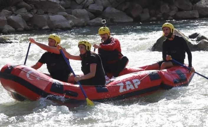 Hakkari’nin Çukurca ilçesinde Zap Nehri üzerinde yapılan rafting su sporu, tüm heyecanıyla devam ediyor.