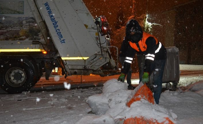 Akşam saatlerinde başlayan kar yağışı belirli aralıklarla etkisini sürdürüyor. Hakkari Belediyesi Temizlik İşleri Müdürlüğü ekipleri kar yığınlarının altında kalan çöpleri temizleyerek ilk kar mesaisine başladı. Yağışın bu şekilde devam etmesi üzerine birçok çöp noktasında çöp almalarının zorlanacağını ifade eden belediye ekibi gece geç saatlere kadar tüm çöp noktalarındaki çöpleri almaya çalışacaklarını belirtti.