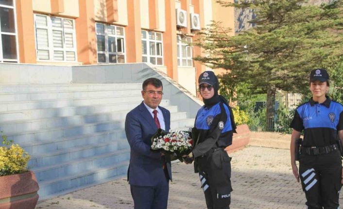 Müdür Yılmaz, Hakkari Emniyet Müdürlüğü kapısında çiçeklerle karşılandı.