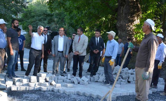 Vali Akbıyık, Belediye Başkan Yardımcısı Hamit Zibek ve Merzan Mahallesi Muhtarı Cemal Çetin, belediye tarafından Merzan Mahallesi’nin Harmancılar, Çiftçiler ve Bostancılar semtlerinde yapımı devam eden parke taşı çalışma bölgesinde incelemelerde bulundu. Vali Akbıyık’a çalışmalar hakkında bilgi veren Başkan Yardımcısı Hamit Zibek, burada 4 kilometrelik parke taşı yolu yapılacağını belirtti.