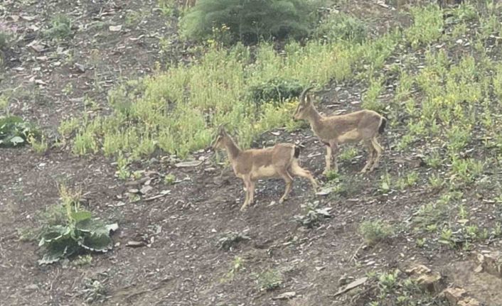 Hakkari-Van kara yoluna inen dağ keçileri, vatandaşlar tarafından ilgiyle izlendi.