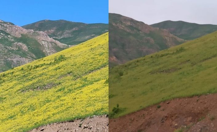 Hakkari’nin Otluca köyünde hidroelektrik santrali civarındaki tepelik alanda gözlemlenen ilginç bir doğa olayı görenleri hayran bırakıyor. Güneşli havalarda açan sarı çiçekler, gün batımına doğru adeta birer birer kayboluyor. Toprağın rengi ve taşların renklerinin de değiştiği fotoğraf karesinde açıkça ortaya çıkıyor. Değişmeyen tek şey ise yem yeşil bitki örtüsü.