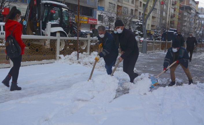 Belediye önü başta olmak üzere birçok noktayı küreklerle kardan temizleyen kürekli kar timleri, çalışmalarını aralıksız olarak sürdürüyor.