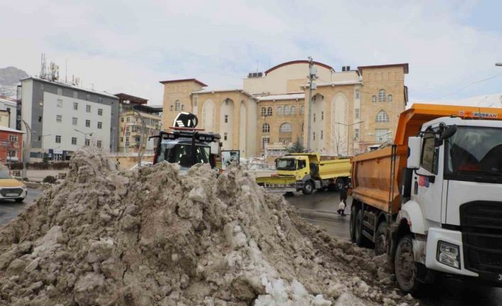 Hakkari Belediyesi karla mücadele ekibi, merkezde biriken kar yığınlarını kamyonlarla şehir dışına taşıyor.