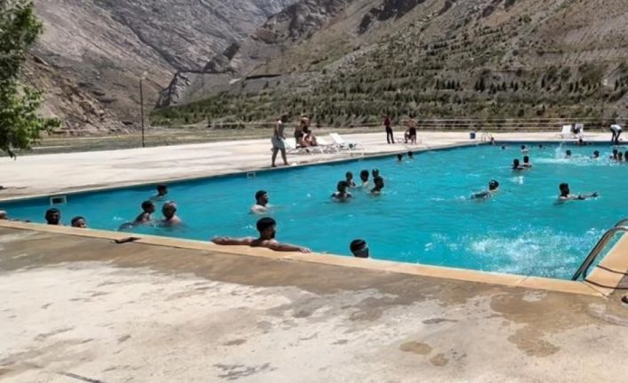 Hakkari’de sıcakların artmasıyla birlikte vatandaşlar yarı olimpik yüzme havuzuna sahip kentin ilk tatil köyüne akın etti.