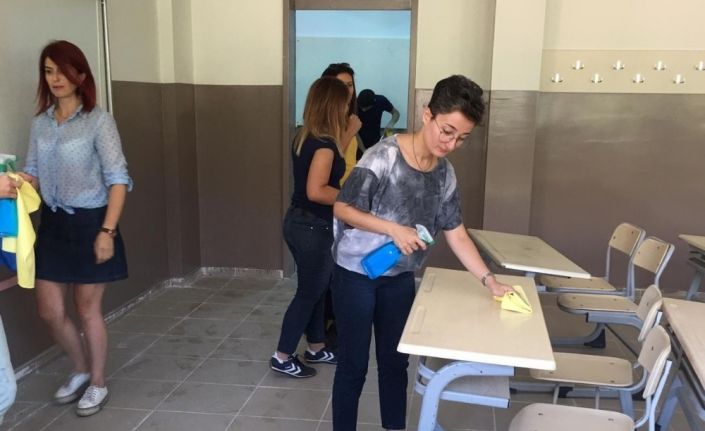 Hakkâri Fen Lisesi müdürü, öğretmenler ve okul personeli ile birlikte 2019-2020 eğitim-öğretim yılına kısa bir zaman kala okulu baştan aşağı temizlediler.