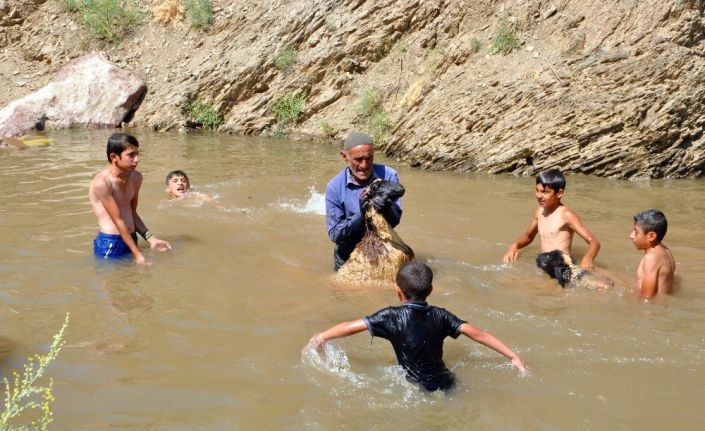 HAKKARİ (İHA) – Hakkari’nin Yüksekova ilçesine 30 kilometre uzaklıkta bulunan Beşpınar Yaylası’nda kırkma öncesi koyunların yıkandığı gölette çocuklar da yüzerek serinliyor.