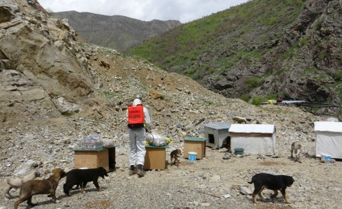 Hakkari’nin Şemdinli Belediyesi, sokak hayvanları için kurulan barınakları dezenfekte ederek mama verdi.