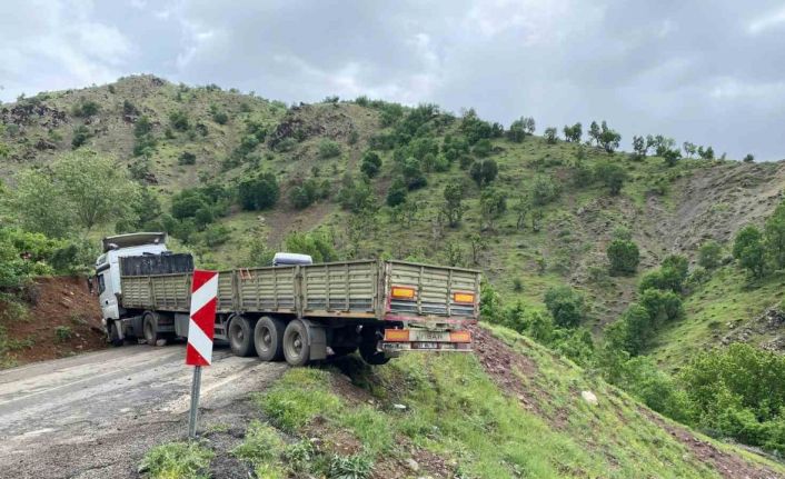 Virajlı yolda mahsur kalan tırı vatandaşlar kurtardı