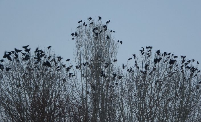 kış ağaç dallarında bulunan binlerce karga sürüsü ilginç görüntülere sahne oluyor.