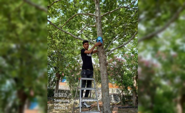 Hatay’ın Erzin ilçesinde Ülkü Ocakları üyeleri ağaçlara kuş yuvaları astı.
