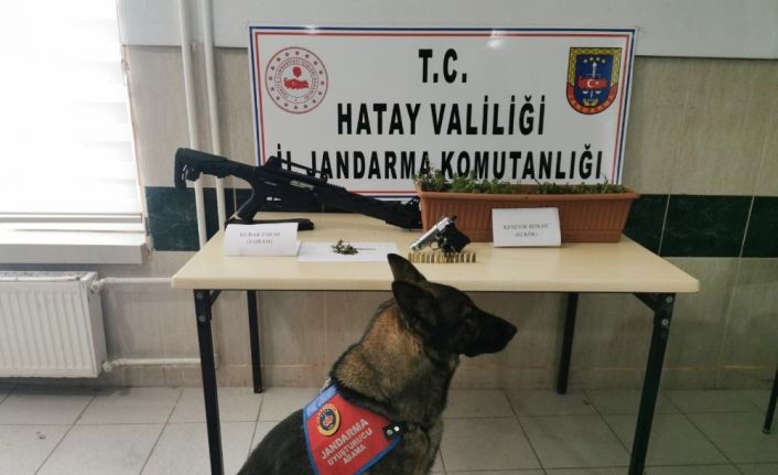 İlçe Jandarma Komutanlığı, KOM Şube Müdürlüğü, Jandarma Suç Araştırma Timi ve Öğle isimli narkotik madde arama köpeği ile birlikte şüpheli şahsın evinde yapılan aramada, 5 gram kubar esrar, evin balkonunda bulunan saksılara ekilmiş 82 kök kenevir bitkisi, 1 adet ruhsatsız otomatik av tüfeği ve 1 adet 9 mm çapında ruhsatsız tabanca ve tabancaya ait 14 adet fişek ve ele geçirildi.