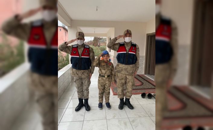 Jandarma ekiplerinin üniforma hediyesi karşısında mutluluğunu gizleyemeyen A.E.Y. üniformayı giyerek kendisini ziyarete gelen Jandarma ekipleri ile birlikte asker selamı verdi.