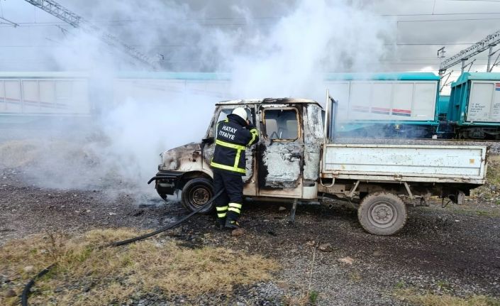 Hatay’da park halindeyken alevlere teslim olan kamyonet kullanılmaz hale geldi.