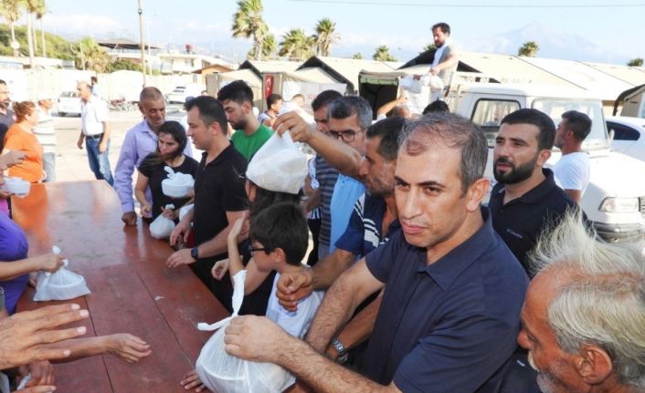 Hatay’ın Samandağ ilçesinde Kaymakam Mehmet Aksu, Koordinatör Kaymakam Alper Kırgıl ile birlikte vatandaşlara "hrisi" yemeği dağıttı.