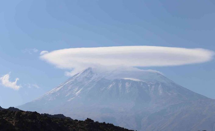 5 bin 137 metre yüksekliğiyle "Türkiye’nin çatısı" olarak bilinen Ağrı Dağı, zirvesindeki bulutun başlık şeklini alması görenleri büyüledi.