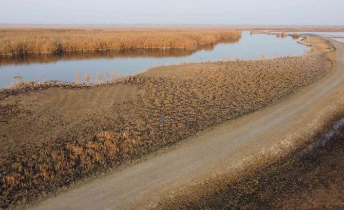 Suların çekilmesi ile küçük adacıkların çıktığı sazlık, görenleri endişelendiriyor. Suların çekildiği alanlar dron ile görüntülendi.
