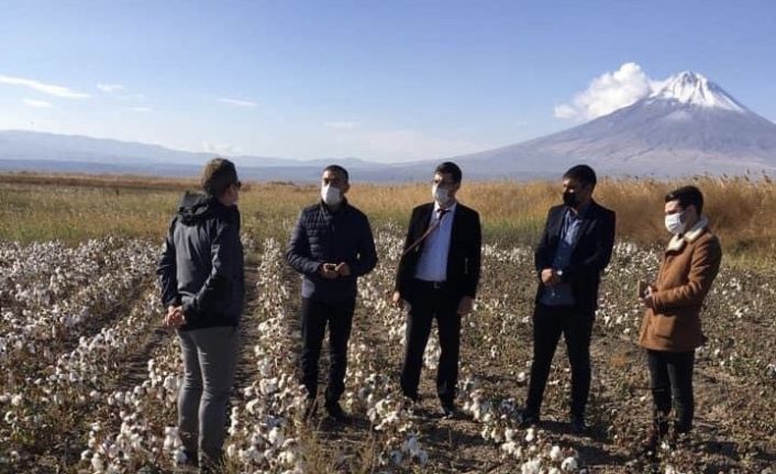Iğdır’ın Aralık ilçesinde bulunan pamuk tarlalarında hasat olgunluğuna gelmiş pamuk tarlaları Kaymakam Mustafa Görmüş, İlçe Tarım ve Orman Müdürü Erhan Eroğlu tarafından gezilerek gerekli incelemeler yapıldı.