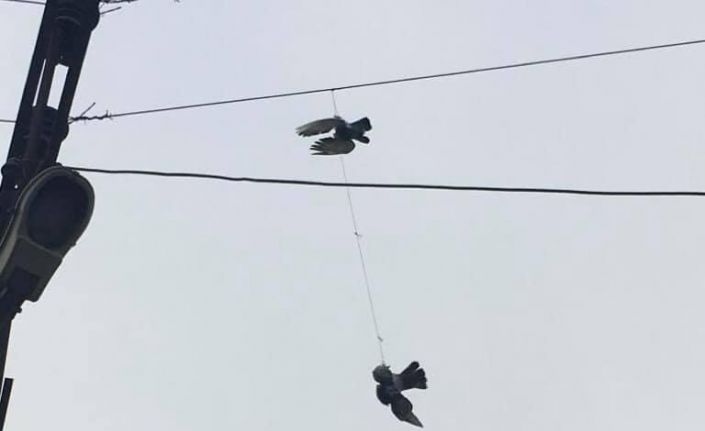 Iğdır merkez Karaağaç Mahallesi Ordu Caddesi üzerinde elektrik nakil tellerine takılan 2 güvercini gören vatandaşlar ekiplere haber verdi. Yardım talebi üzerine olay yerine gelen itfaiye ekipleri, ayaklarına bağlanan ip nedeniyle elektrik tellerinde asılı kalan güvercinleri kurtardı. Gerekli bakımlarının yapılması için güvercinler Doğa Koruma ve Milli Parklar Şube Müdürlüğü ekiplerine teslim edildi.Elektrik tellerine takılan güvercinler kurtarıldı