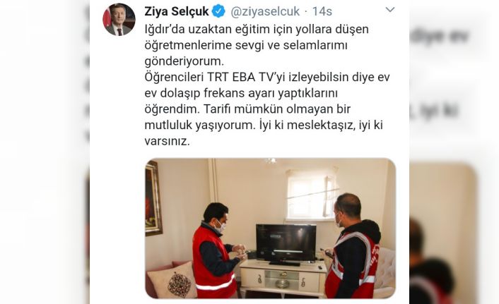 Yeni tip korona virüs (Covid-19) önlemleri kapsamında uzaktan eğitim verilen EBA TV ve TRT yayınlarının frekans ayarlarını yapmak amacıyla görevlendirilen 20 öğretmen köy köy dolaşıyor. Öğretmenlerin bu çabasını gören Milli Eğitim Bakanı Ziya Selçuk, sosyal medya hesabında öğretmenlere sevgi ve selamlarını gönderdi.Ziya Selçuk Twitter paylaşımında, “Iğdır’da uzaktan eğitim için yollara düşen öğretmenlerime sevgi ve selamlarımı gönderiyorum. Öğrencileri TRT, EBA TV’yi izleyebilsin diye ev ev dolaşıp frekans ayarı yaptıklarını öğrendim. Tarifi mümkün olmayan bir mutluluk yaşıyorum. İyi ki meslektaşız, iyi ki varsınız” sözlerine yer verdi.