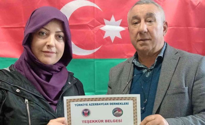 Türkiye Azerbaycan Dostluk Dernekleri Federasyonu Genel Başkan Yardımcısı ve Iğdır Azerbaycan Evi Derneği Başkanı Serdar Ünsal, Türkiye Azerbaycan kardeşliğine destek veren Şehit Gazi Sen Sağlık Genel Başkan Yardımcısı Ayşe Gölçek’e teşekkür belgesi verdi.