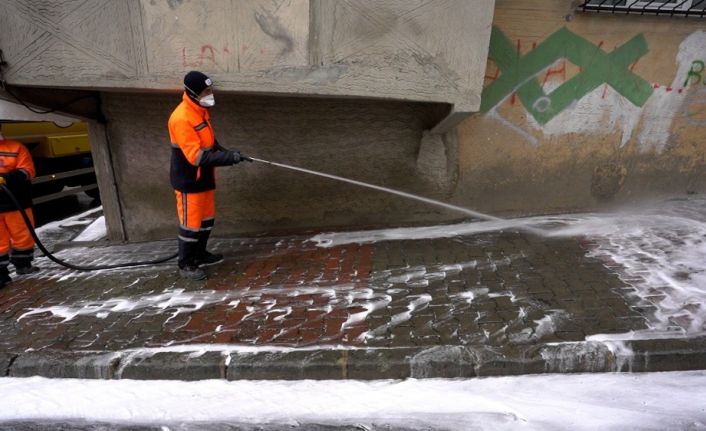 Başakşehir Belediyesi ekipleri, koronavirüs salgını tedbirleri kapsamında Güvercintepe Mahallesi’nde sokak ve caddeleri sabunlu su kullanılarak temizledi.