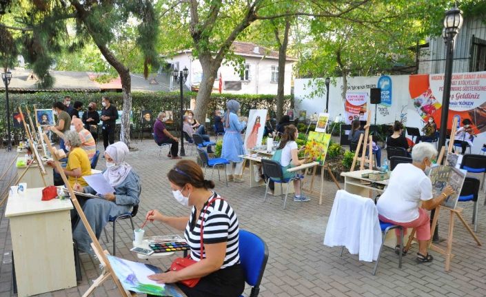Konuşma sonrası yapılan çalışmaları yakından inceleyip, eğitmen ve kursiyerlerle sohbet eden Başkan Deniz Köken, tuvalin karşısına geçerek resim çalışmalarına da katıldı.